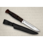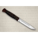 Универсальный легкий средней величины нож без упора. Неширокий прочный клинок толщиной 4 мм с приспущенным обушком имеет вогнутые линзовидные спуски более чем на половину ширины клинка, образующие тонкое лезвие. На голомени с обеих сторон клинка выбраны узкие долы, добавляющие жесткости клинку. Небольшая эргономичная рукоять на удивление хорошо ложится даже в большую ладонь. А расширенная головка рукояти хорошо способствует ловкому извлечению из ножен. Монтаж клинка сквозной не разборный. Заслуженно пользуется популярностью.