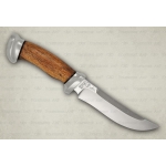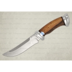 Средний, универсальный, красивый и прочный нож с хищным клинком восточной ятаганной формы, имеющим вогнутые линзовидные спуски на две трети ширины клинка, образующие тонкое, прекрасно режущее лезвие. Весьма серьезный инструмент. Клинок толщиной обуха в 4 мм имеет прогнутое двустороннее фальшлезвие, которое может быть использовано для рубки мелких костей и хрящей. Эргономичная форма рукояти удобно и прочно ложится в ладонь. Монтаж клинка сквозной, не разборный. На навершии рукояти имеется красивое расширение в форме грибка, которое в сочетании с приличной гардой позволяет уверенно и безопасно работать ножом.
