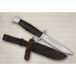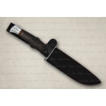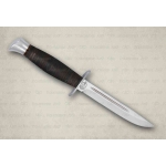 Универсальный очень легкий средней величины нож с развитой стальной гардой классического типа. Нож прекрасно сбалансирован. Неширокий клинок толщиной 2,4 мм с приспущенным обушком имеет вогнутые линзовидные спуски на половину ширины клинка, образующие прекрасно режущее лезвие. На голомени с обеих сторон клинка выбраны узкие долы, добавляющие жесткости клинку. Небольшая эргономичная рукоять на удивление хорошо ложится даже в большую ладонь. А расширенная головка рукояти хорошо способствует этому. Монтаж клинка сквозной не разборный.