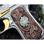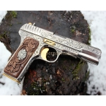 Охолощенный пистолет тт схп от Тульских мастеров. Ручная работа гравировка по металлу щечки орех, герб серебро. Пистолет Тульский Токарев военного 1942 года с широкой насечкой на затворе. Применяемый желтый цвет на деталях пистолета, это нитрид титана гораздо более прочный материал на истирание ежели позолота.Под калибр холостого патрона 9 мм люгер.