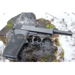 Охолощенный после военный немецкий пистолет Вальтер П38 Р1. Работает на холостом патроне 9х19. В 1957 году Бундесвер принял на вооружение пистолет Р1, отличавшийся от первых Р38 только алюминиевой рамкой. При этом коммерческий вариант того же пистолета по-прежнему именовался Р38. Выпуск коммерческих пистолетов Р38 со стальной рамкой в послевоенный период был довольно незначительным. В 1975 году в конструкцию пистолетов Р1/Р38 был введен усиливающий поперечный стержень шестигранного сечения, расположенный в рамке в районе размещения запирающей личинки ствола. В начале 1970х годов для унификации и модернизации весьма разношерстного парка пистолетов немецкой полиции был разработан и одобрен для использования пистолет Р4, представлявший собой модификацию пистолета Р1/Р38 с укороченным стволом и модифицированным предохранительным механизмом. В производстве пистолеты Р4 продержались до 1981 года, будучи вытесненными более совершенной моделью Walther Р5. Интересно, что некоторые серийные пистолеты Р4 имели маркировку «P38 IV», а не «Р4», из чего можно сделать вывод, что их переделывали из обычных пистолетов Р38. Несколько позже специально для скрытого ношения сотрудниками антитеррористических подразделений ФРГ был создан еще более короткоствольный вариант Р38К, имевший ствол длиной всего 90мм, едва выступавший вперед из короткого кожуха затвора.