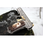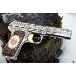 Очередной шедевр от Тульских оружейников прекрасный подарочный вариант охолощенного пистолета ТТ довоенного 1940 года! Вся красота экземпляра на фото! Художественная гравировка по металлу , накладки орех с всечкой серебра, кость мамонта с скриш-шоу (резьба по кости) тов Сталина.