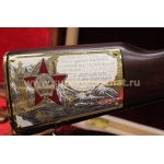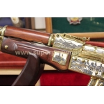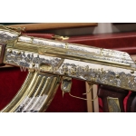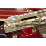 Оружейники из Златоуста создали точную копию наградного АКМ с прикладом, на котором размещается именная гравировка. Мастера уральского города Златоуст, который с начала 19 века славился своей технологий гравировки по металлу, создали точную копию автомата Калашникова, которая станет уникальным подарком для первых лиц. Украшенный АК-47 хорош в подарок Коллекционная полноразмерная модель золотого АК 47 с гравировкой в точности повторяет боевое оружие. На видео можно посмотреть, как у нее двигается спусковой механизм, работают все затворы, газовый поршень и ударно-спусковой механизм. Оружие украшено позолотой и авторской гравировкой, поэтому цена такого коллекционного подарка составляет 410 000 рублей, но она оправдана на все 100%! Коробчатый магазин и ствольная коробка имеют съемную крышку. Приклад сделан из дерева и инкрустирован позолотой. Такой автомат Калашникова в подарок можно подарить в специальном подарочном кофре.
