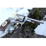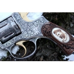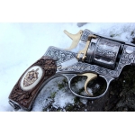 Отличный охолощенный револьвер системы Наган, 1938 года с изображением Ф.Э Дзержинского. Охолощен с боевого пистолета под холостой патрон калибра 10тк, ручная работа Тульских мастеров, щечки орех, желтое напыление нитрид титана, кость мамонта с скрим шоу (резьба по кости)